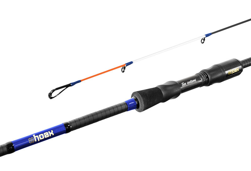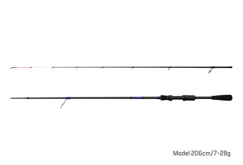 The series of modern and well-designed rods with significantly fast blank designed for all those who love to chase and fish for zanders, pikes, perches or asps. Elegant blank in matt grey make will definitively attract you as well as it attracted us. At its bottom third as well as under the reel seat there is a spiral winding of darker carbon which adds to its wild, modern and sport design. The reel seat is split, uncovers a part of the blank due to which you can feel even the softest bites. Apart from that there are carbon details on the seat. This series is made in two makes, which make you have can be found on the uncovered part of the blank in the reel seat. Blue and purple components which can be found under or above the reel seat as well as the under the writing looks very well. The winding of the guides is also done in blue and purple, which looks great. There double-leg guides. Significant red and white can also be found on the tip of the rod, so fishing in the darkness will not be a problem. The rod has semi-parabolic action especially in it top part, meanwhile the bottom part keeps its stiffness due to which we can make long casts or well as brave wilder fish. These rods will spread as hoax thanks to their undoubtedly great attributes.
