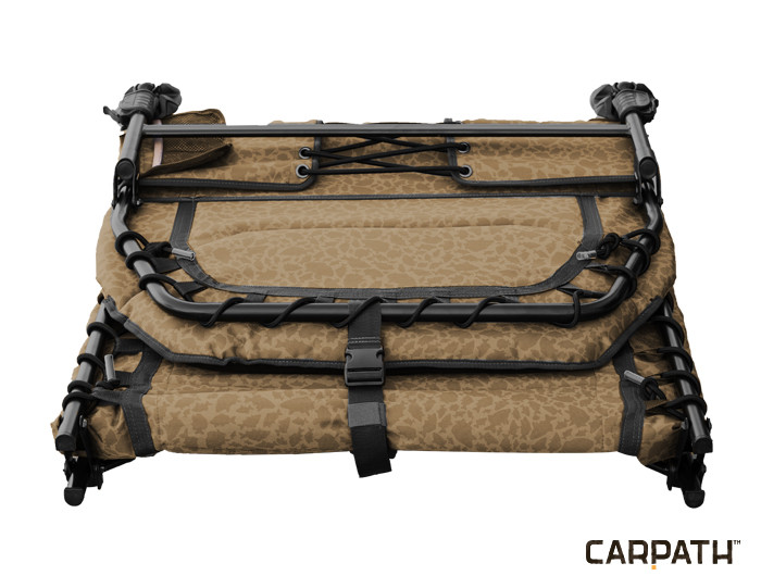 When designing this bed-chair we were determined to design six-legged bed-chair which is the exact opposite to standard models with thin mattresses and weak construction. Our six-legged, strong construction which creates the base for this bed-chair was made very precisely into every detail. Bearing surface of the legs is very sturdy and flexible which means that they can adjust to any uneven ground. There is a comfortable mattress placed very carefully on the construction. It is attached to the construction by means of rubber belts and extra reinforced cloth. As the result, there is less visible wearing-out of this mattress even after several years of the use as well as it keeps all its use and comfort value. High comfort- these are the words that can be used to define this visually interesting bed-chair. The thick mattress is made by the combination of 600D cloth with a camouflage printing of Carpath and nice fleece cloth layer which is placed in the middle and goes up to the head part. It is fitted with a belt with connector which makes its transport much easier.