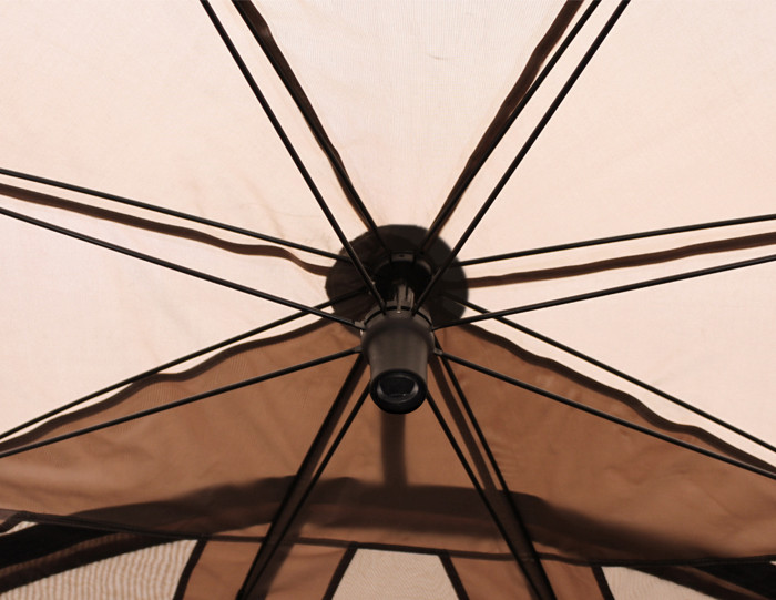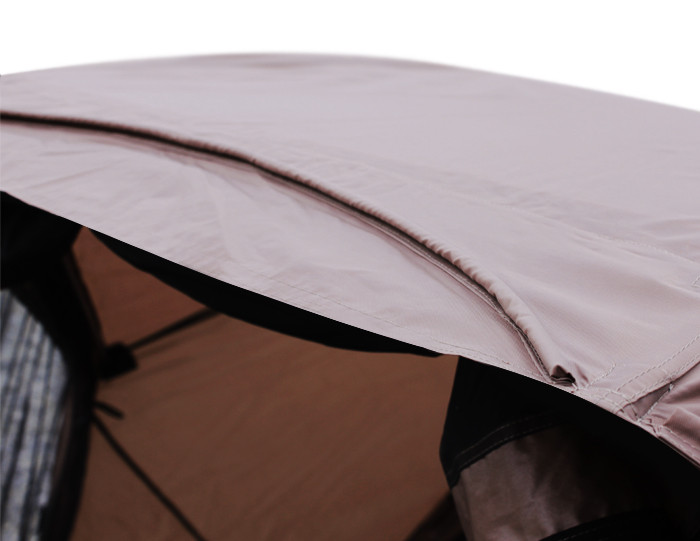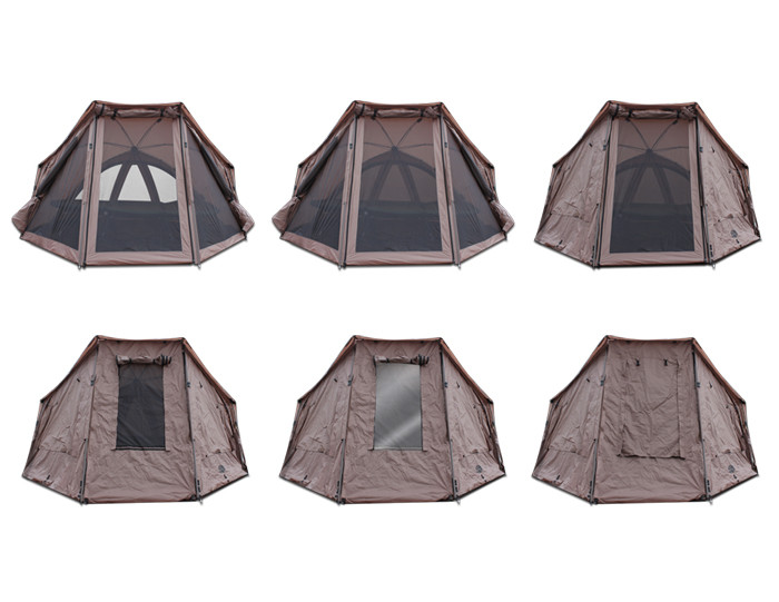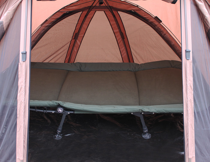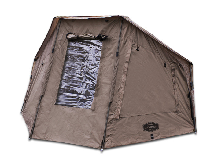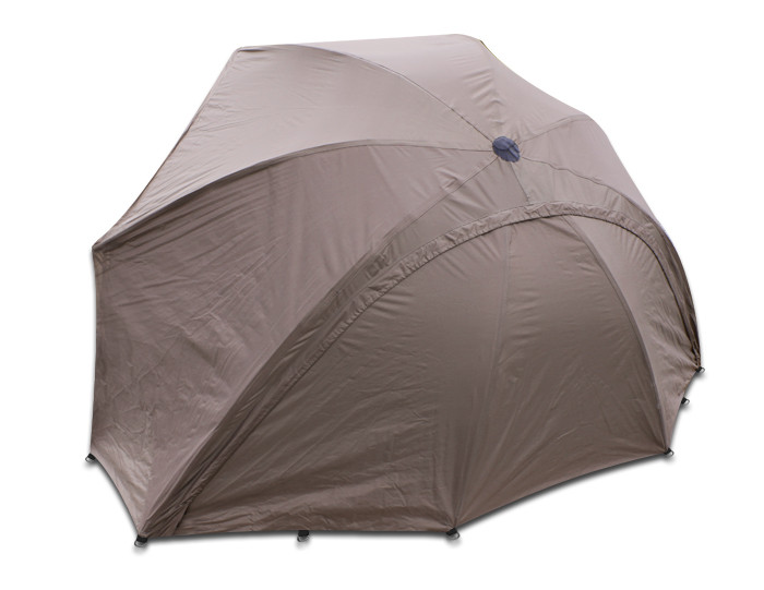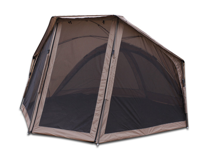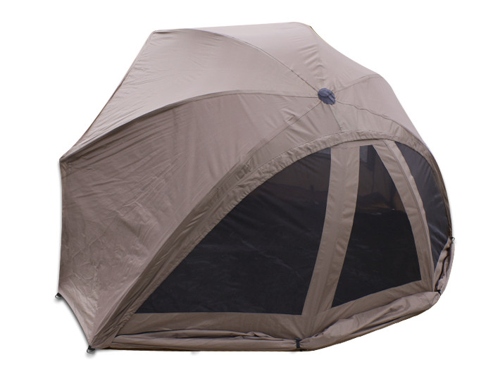 A new brolly YAMAL by Delphin is a top-class product in all aspects. It will surprise you by its variability and with many elaborated details. The base is created by a strong construction that opens as a usual umbrella. Thanks to this innovative system this brolly will give you much more space inside and you are not limited by its system of opening. The whole mechanism inside is only 12cm long. This basic construction is covered by light-brown, water-proof textile with pasted seams. The front part of the brolly has four extra poles and their length can be adjusted. These poles can be easily screwed to the construction and resistant drills are on the bottom of each pole. You can choose from two front panels that are included in the package and can be combined. They are fastened by means of large zips that are placed along the whole circumference. These zips are covered by a cloth so they don´t get soaked and are waterproof. The basic front panel is a so called mosquito panel which is divided into two windows on sides including a front door. As there are three windows in the back panel of the brolly we can get a fresh and gently breeze inside of it in case of very hot weather. This back window has got two positions – a full cloth window and a mosquito net. The rear panel is so called a full panel divided also into two windows and one door. This panel can be tightened to the sides of the brolly partially as well as it can be fully tightened to the sides. The windows are full with the possibility to be fastened separately. There is another window on the door that can be either full with a cloth, transparent with a foil or typical mosquito net. Inside the brolly there is a resistant floor (attached by Velcro) with a marked entrance sign so it makes it easier when building it. The top part of brolly contains of some leak drains which drain rain water away so the water doesn´t leak down along the sides of the brolly and in front of its door. Of course, there is a holder for two fishing rods tightened by a Velcro in the front peak. So that the brolly is very strong even in case of strong winds, there are twelve anchoring points all around it. It is attached to the ground by resistant pegs that are included in the package. Delphin YAMAL will definitely satisfy even the most demanding customers.