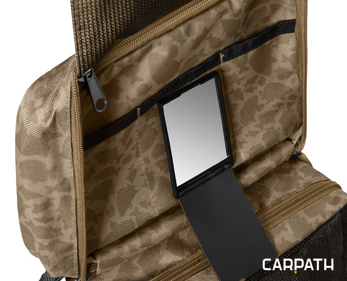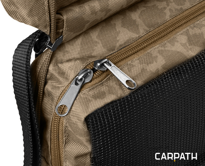 The case is equipped with a high-quality zipper in brown color. Zipper puller comes with a plastic drawstring. It is quite handy and allows you to open the zippers easily. The accessories are matching with the overall design. This case will be complemented by our unique brown CARPATH camouflage design consisting of carp shapes.