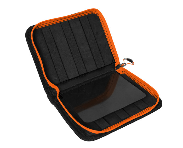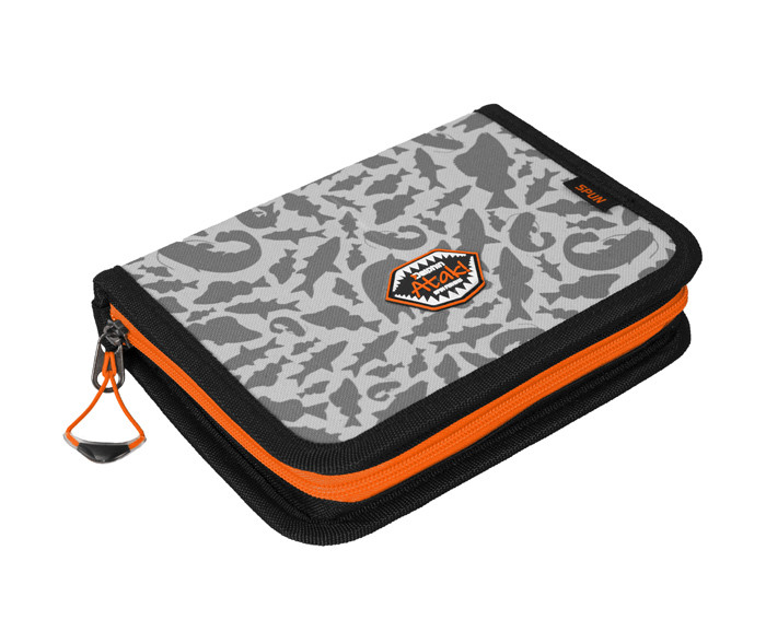 The case is equipped with a high-quality zipper in orange color. Zipper puller comes with a plastic drawstring with wide orange strap. It is quite handy and allows you to open the zippers easily. The accessories in orange color make this case more visible in the dark. This case will be complemented by our unique gray ATAK! camouflage design consisting of predatory fish shapes.