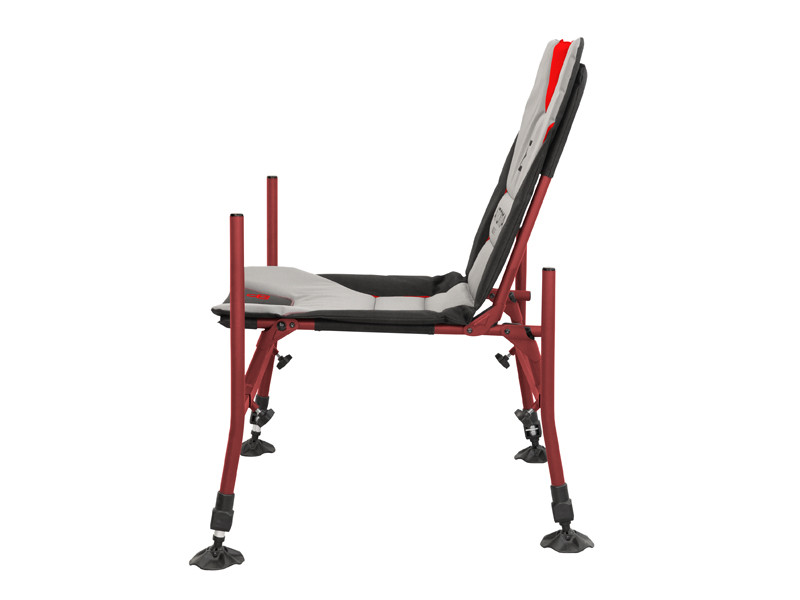 RaceBase is a premium feeder chair that will attract the attention of demanding fans of this fishing technique. The basis of the chair is an extra strong iron construction, with a burgundy finish, characteristic for the products from the ATOMA series. Due to its design and the material used, it will not have a problem even with heavier weight categories of fishermen. The seat and back part is sewn from a very durable fabric and carries several interesting ergonomic and design elements. The soft padding guarantees that you will feel as comfortable as possible even during a longer fishing or feeder race. The individual legs of the chair are inserted from the side into the tubes with a square profile, thanks to which any overturning is prevented. In addition, they are tightened by a screw mechanism obliquely to the edge of the profile, which prevents damage and deformation of the individual pipes. The front pair of legs, compared to the back, has significantly elongated top tubes. This solution is not common, but it is an absolutely functional detail. Thanks to the longer leg, you can place more elements on this profile, and such design gives the chair much greater variability. You will have everything at hand at the same time. All four legs are extendable and are also equipped with high-quality articulated heels made of solid plastic. Thanks to this, the chair will be able to be spread out even in uneven terrain. In addition, the heels prevent the chair from sinking into the ground, in the case of a softer surface. When designing, we also thought about the stability of the chair, and therefore we added a locking mechanism to the front pair of legs, which prevents the chair from tilting and subsequently overturning when using large and heavier feeder arms. Maximum comfort, elaborate and extra stable - this is the Delphin ATOMA RaceBase chair!