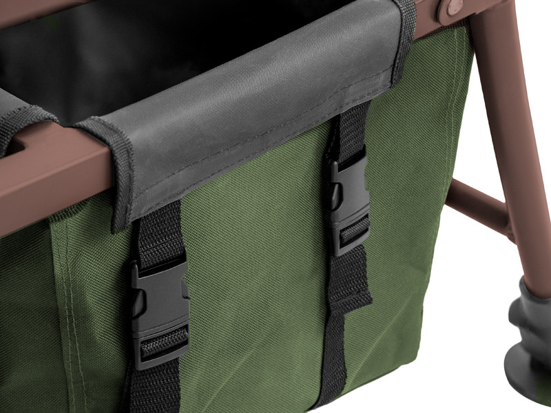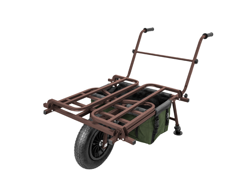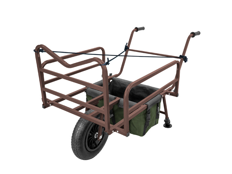 A luxury fishing trolley designed by the Delphin brand, which will aid you in bringing everything you need for fishing no matter where you go. The basis of the frame consists of extra strong iron tubes with a square profile and a side length of 22 mm. No question, this trolley can carry a really large amount of equipment. The generous storage area also provides enough for placing large pieces of equipment, i.e. deck chairs or armchairs. On the sides the trolley is equipped with massive side rails that ensure that all of your equipment stays in place. The front side rail is raised and thus prevents the loaded equipment from moving in a more effective way. This is also aided by two rubber straps with adjustable length that come supplied with the trolley and that are intended for perfect fixation of the transported equipment. The trolley has a large and wide wheel with a tread pattern, thanks to which you can easily manage crossing hard terrain, very uneven terrain or even mud. The wheel is fastened to the trolley with screws and can be removed after use, which contributes to smaller transport dimensions. An indisputable advantage is also the support legs with the locking pin. Thanks to them, the trolley always stays in its place. The legs are extendible and equipped with feet, which means they can be adapted to the terrain and prevent the trolley from tipping. For those who still need more transport space, there is also the option of a large bag (dimensions - 50x30x30 cm) that can be attached using buckles to the lower part of the frame. Thanks to the volume of the bag (45 L), you can pack a lot of equipment in it that would be more difficult to pack on top of the trolley. The trolley is fitted with two handles with a rubber handhold for a better grip. These make the trolley very easy to push. The handles are fastened to the trolley, similar like the wheel, using screws, and these can also be removed after use, making the trolley even more compact. So if you are a fisherman looking for interesting places that are hard to reach by car, the Delphin CROSSTRAQ trolley is the right solution for you!