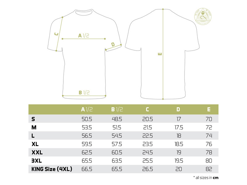 The T-shirt itself is of high quality, as is the colour used on the printing. We offer them in a wide size range from S to KING SIZE (equivalent to 4 + XL, referred to as XXXXXL in most countries. The King size model will easily dress even the biggest fishermen weighing 135 kg +.