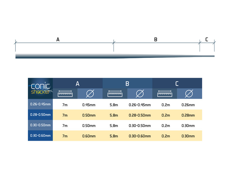 | 101002308 | Tapered leader Delphin Conic SHOCKER / 6x13m 0.28mm-0.50mm |