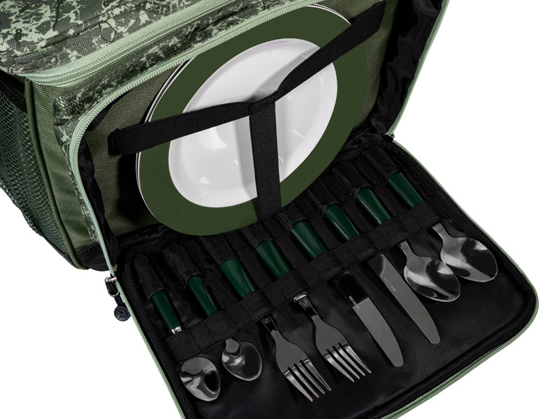 It contains two plastic plates, two knives, two forks, two spoons, and two dessert spoons. From now on, your fishing sessions will me much more comfortable, even with another person around.
