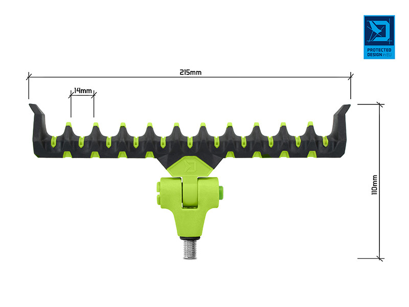 A high quality rod holder designed in colours of our innovative feeder series Delphin Reaxe. As the name suggests, the Flexi model is fully adjustable with a simple pressing system that allows to adjust the tilt of the rod when fishing on a river, in windy weather, or on an uneven terrain. It’s wide enough to adjust the rod position after casting for an optimal curve of the tip without the need to reel in excessive amounts of the line. The holder is made from sturdy materials, so it won’t get damaged or scratched that easily. It has a special shape to keep your rod in place even in case of an aggressive bite. The surface is coated in rubber material that protects the rods against damage. It has a universal thread compatible with all standard arms, holders, and banksticks. A rubber washer on the thread prevents the holder from rotating. Flexi can be used with two rods.