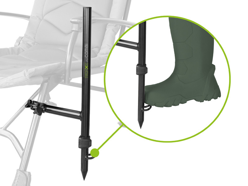A practical holder for feeder rods, designed mainly for different types of REAXE front buzz bars. It’s based on a T-shaped aluminium structure fitted with plastic clips and a versatile thread in the upper part, compatible with most feeder holders on the market. It can adapt to an uneven terrain with a telescopic metal leg and you can stick it in the ground by stepping on it with your foot to increase stability. The metal leg can be extended up to 23 cm and secured with a clip. Plus, it’s attached to a sturdy string so you won’t lose it. A plastic clip with a locknut can be attached to standard chairs. Plus, it can be rotated and attached in any angle. UniFIX COMBI is available in black with a bold green inscription REAXE to match this feeder series.