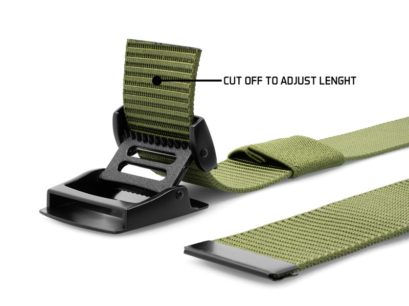 It has a black matte metal buckle with an OutLINE carp motif. The buckle has a simple mechanism that secures the belt in a desired length. The belt itself is made from black heavy duty fabric and it’s long enough to be adjusted to your needs.