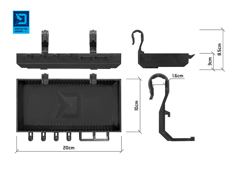 There are also hooks in front to hang your rigs. They can be used for needles, scissors, or other small components. Removable dividers allow you to optimise the storage room according to your needs. The shelf is designed in a favourite black design BlackWAY and it goes very well with our holders.