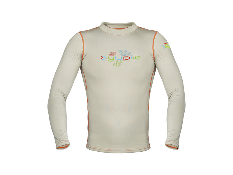 The top has long sleeves and collar to keep the body’s temperature optimal. The elastic collar, the cuffs, and the bottom part have a snug fit on the skin to minimise the heat loss. The bottom part of the top is slightly longer to overlap with Delphin YUPIE bottoms even when moving about.