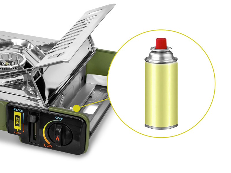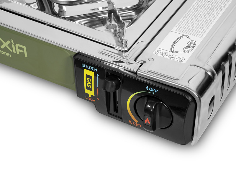 The stove is powered by CP250 type propane-butane cartridges with a volume of 400 ml. It features a two-stage safety system, ensuring maximum safety during use. To ignite the flame, the cartridge must first be fixed in place using the lever on the front of the stove. This significantly reduces the risk of unintentional gas leakage or automatic release.