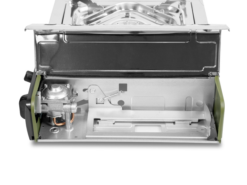This is an exceptionally stable model built on four legs, making it reliable whether you place it on a table or on the ground. Thanks to its durable grate with generous dimensions, you can cook with confidence even using a larger pot or pan. To prevent wear from high temperatures, both the grate and the stove body are made of stainless steel, which is also very easy to clean. The cut-outs in the grate reliably prevent cookware from slipping during stirring.