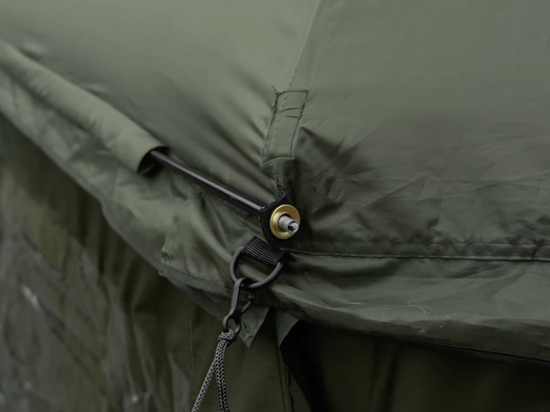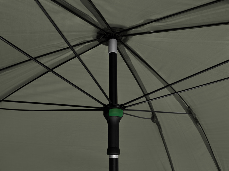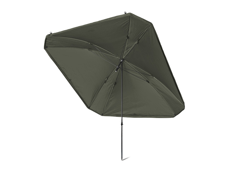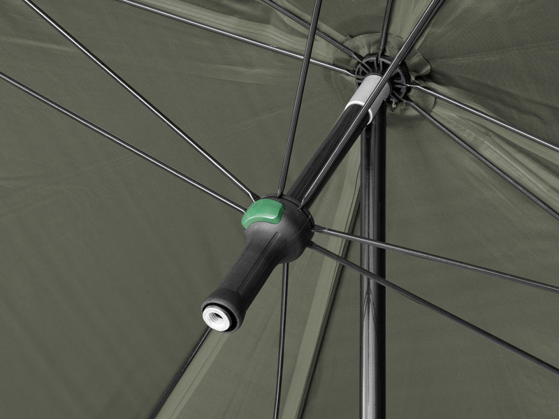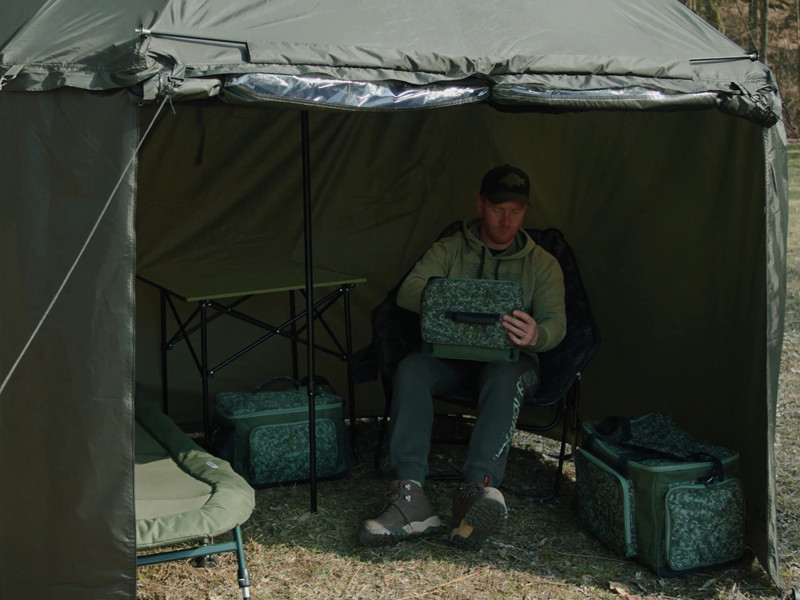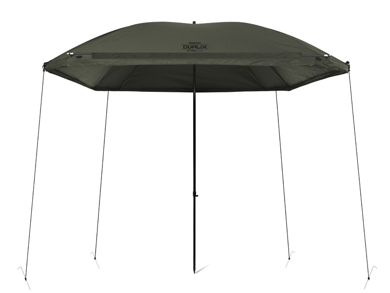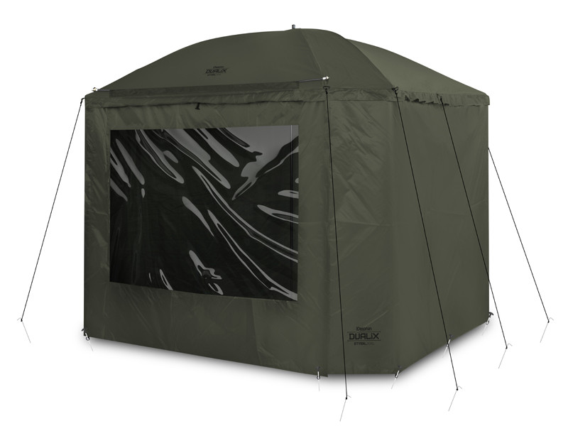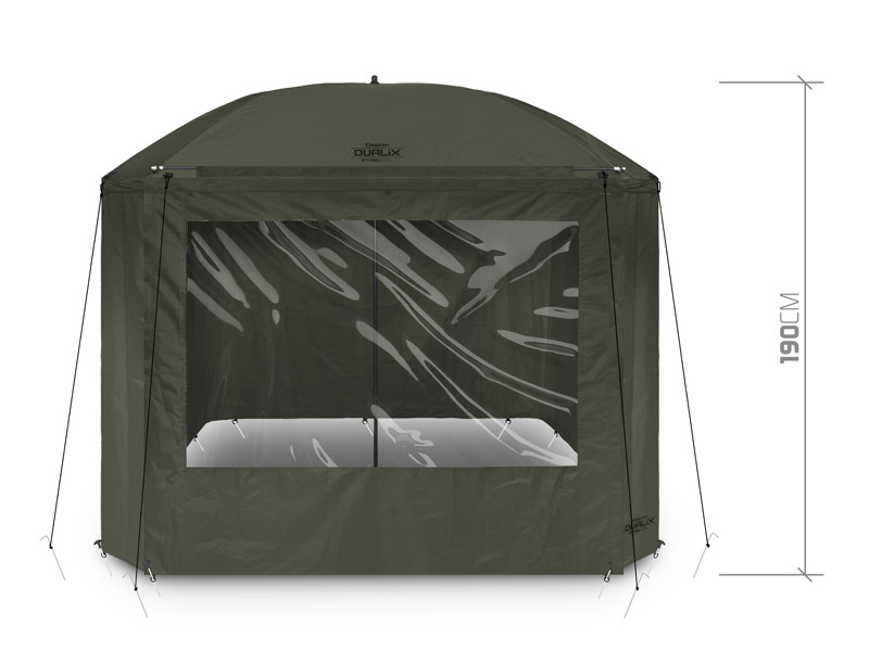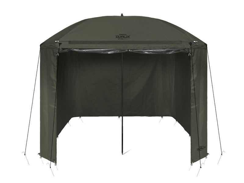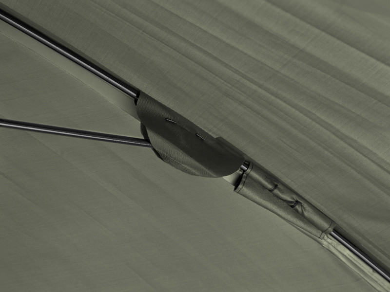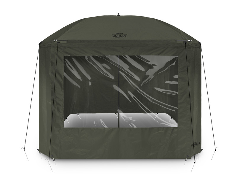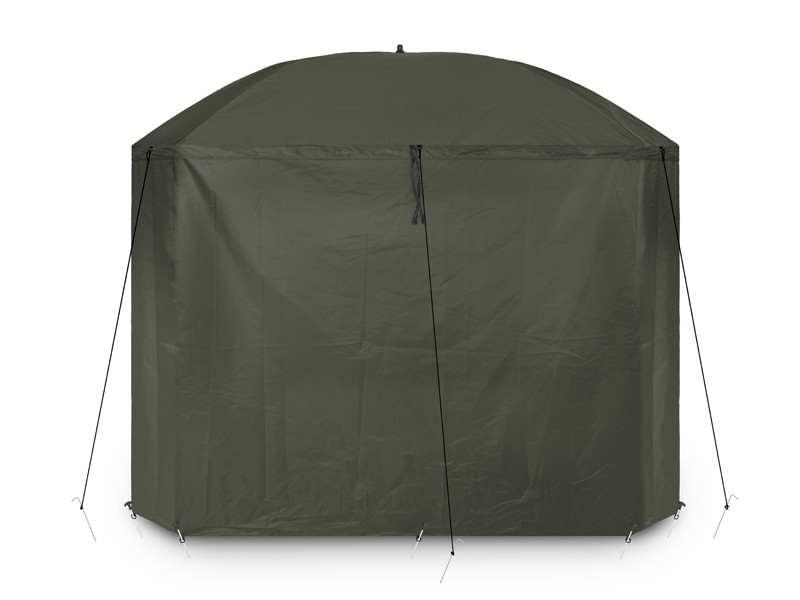 The umbrella has a dome dimension of 320 cm and it easily accommodates two beds and many other accessories. It also features a fully closeable side wall to shelter you from bad weather and to provide bivvy-like comfort. The front door of the side wall has a transparent window to keep an eye on your rods and the environment.