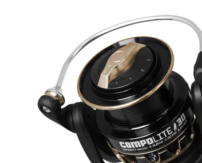 COMPOLITE is another member of our family of lightweight reels designed specifically for spin fishing, but it can also be used for float fishing or light feeder fishing. It has a gear ratio of 5.1:1 and the 7 bearings ensure trouble-free usage. The body is made of a composite carbon material that makes it ultra light, while maintaining maximum durability. The basis of the internal mechanism has been tried and tested making the reel very reliable and it offers solid performance. The reel comes with a lightweight aluminium coil. However, buying additional coils is no problem. These can also be made out of metal. The metal handle with a comfortable EVA foam handle knob can be used by both left or right handers. The bail is made out of coarse wire making it very durable and long-lasting. The action of the bail is very quiet and smooth. The standard model contains a combination of metal and carbon drag pads, making drag tightening and loosening very fast and very efficient. As far as design goes, the COMPOLITE is a beautiful reel with a matte black finish and different matte copper elements. It will immediately becoming an embellishment on every rod or a treasure amongst the equipment of any modern day fisherman.