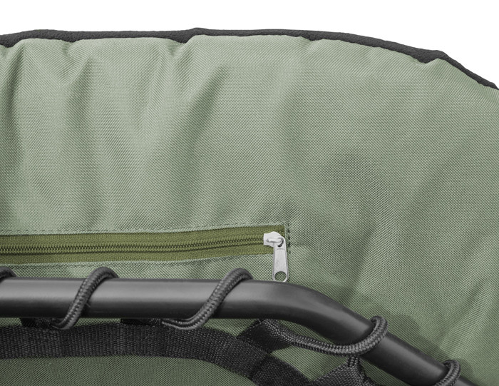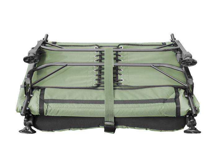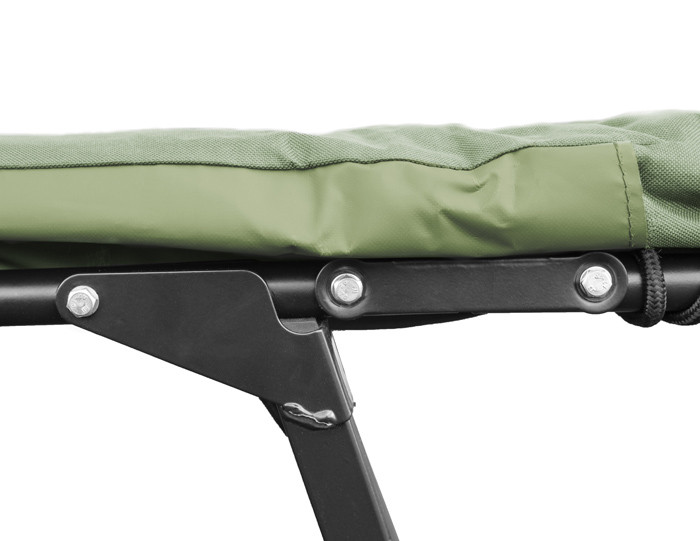 Extra-high bed AP8 FlatLux with a flat and really resistant metal construction is rightly considerable as our top comfortable and luxurious model of fishing bed chairs. A really spacious size of the mattress of 210x90cm offers a true relax during fishing and camping trips. The mattress is so comfortable due to its three soft fleece panels of khaki colour in the combination with a 600D green cloth. The head part is made of the combination of black and khaki fleece. In its bottom part there is a special washable material. In case your bed chair is dirty from your muddy shoes, you can easily clean it with a brush and water. The firmness of the mattress can be changed in its head, leg and middle part by means of strong straps that won´t stretch after being used for a long time. Each pair of legs can be locked be a bayonet pin so there is no unwanted tilt or irritating folding leg when moving the bed is the past. Inner two pairs of legs have strengthened construction. The seating feet of the legs are flexible, massive and allow adjusting to any uneven terrain. The height of the bed-chair is 40cm and after unfolding the telescopic legs, the height of legs is up to 57cm. Such a high bed offers extreme comfort for lying down and sleeping. The mattress is from the bottom part and above the joint mechanisms strengthened by means of rubberized cloth. The speciality is it inner space with a zipper under the head part. There you can place things that you need to have close to you at night. It is a great place for placing in the mobile phone, a receiver, a lamp or a bottle of water. After being folded it can be fixed by a strap with a plastic clip. This strap can be removed. AP8 FlatLux is perfect bed chair of the highest quality made perfectly into every single detail.