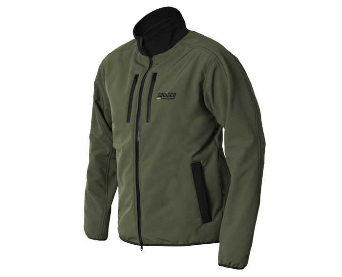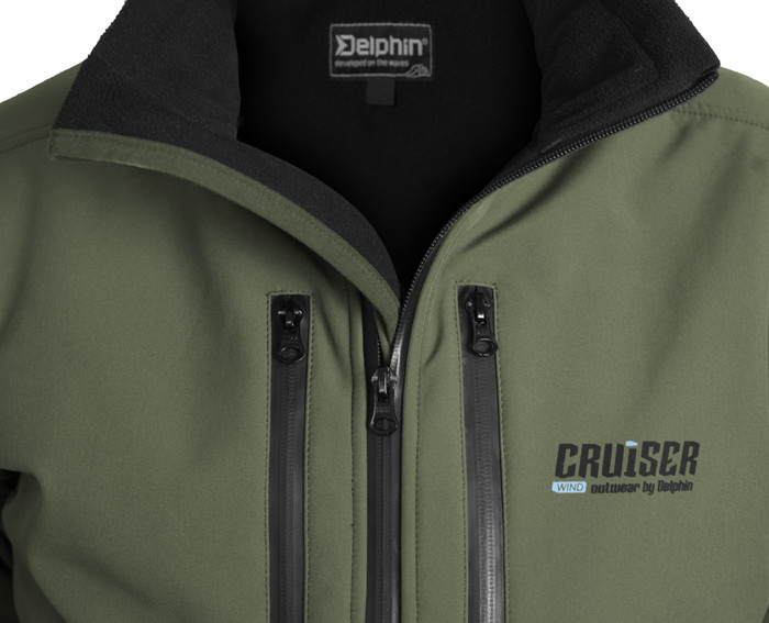 Delphin CRUISER Wind softshell jacket will become your loyal companion during the colder and windy days by the water. There is a windproof membrane with a water column of 5000 mm and breathability of 1000g/m2/24h between the outer and inner layer of the jacket. There is a cover hem of the zip fastener at the chin level on the stand-up collar. The main zip fastener and zip fasteners of the pockets on the chest are waterproof. The side pockets do not have zip fasteners. The sleeves and the bottom of the jacket are fitted with an elastic patent. The inner part of the jacket is made of a comfortable black fleece material, the outer part consists of a green-black material. Due to the windproof membrane, the jacket is water repellent, but not waterproof! The Delphin CRUISER Wind Jacket is comfortable, very easy to wear, slightly elastic and looks great. Outdoor Softshell provides very good thermal insulation. The jacket is suitable for all-day activities in colder, dry and relatively stable weather. To prolong its properties, treat the jacket with a softshell impregnant after each washing. When washing, it is recommended to use special washing detergent for functional clothing, wash at max. 40 °C, not to spin-dry and, if necessary, to use an impregnating detergent to restore the durable water repellent (DWR) finish of the outer material: 94% Polyester, 6% Spandex.