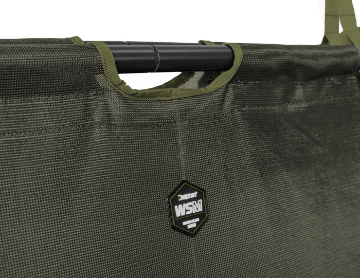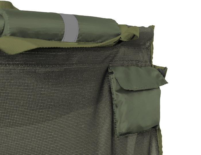Weighting bag made of strong net material which can also be used as keeping sack for the time of weighting the fish or before you release it as it has some floats and net material. Thanks to reflexive tapes on the floats you can see the bag in the water even when you light on it by your head lamp in the darkness. Net material lowers the overall weight of the bag and when lifting the fishing or during manipulation with it, the water leaks out and it doesn´t overload the material so the weighting is more precise. Massive zippers are on the both sides as well as in its upper part so WSM can be nearly fully unzipped for nicer and easier manipulation with the fish. Strong aluminium tubes with the diameter of 25mm can be folded without any problems so they do not need much space during transport. There are three long textile straps, so hanging it on the tripod is really comfortable and simple. These straps have a metal loops for hanging the bag on the weight´s hook. For easy carrying of the bag, there are four shorter straps on the corners of the bag. An anchoring line with the length of 4,5m and with a thread in the end is a necessity, too. Thanks to this system, anchoring the bag on the shore is very safe. The line is placed in an integrated and discrete bag on the side of the bag. On the upper part and on the side of the bag there is a clip which serves for fixing the zipper runners to prevent any unwanted opening of the bag. There is also a possibility for additional purchase of clips that can be used as other parts for anchoring.