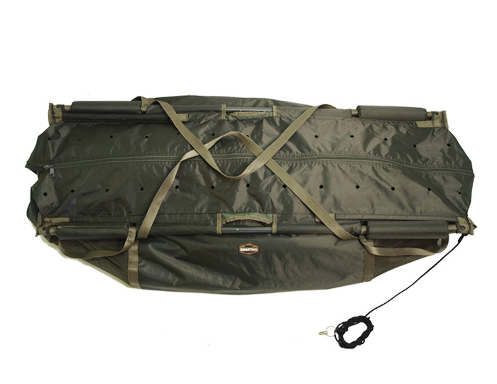 This weighting bag is a precisely made gem that is a must for every angler and every carp fishing accessory. Its basic element is its solid top part made of aluminium tubes. Thanks to its ingenious mechanism it is possible simply spread these tubes so they don´t take too much space during transport. There are four floats placed on these tubes which together with pierced parts of the bag make it possible for you to keep the fish inside or release the fish back to water. Undoubtedly, GOLEM also has 2.5m long anchoring line finished by a thread so the bag can also be anchored on the shore. There is a zip along the whole length of the bag so it can be closed perfectly. Due to the long, textile lugs it can be hung on weighting tripod comfortably. For casual transport there are shorter belts placed in the corners of the bag.
